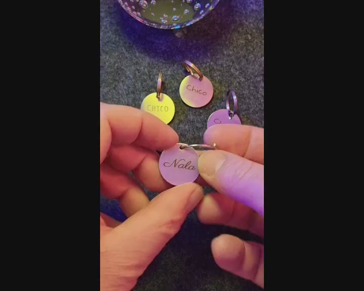 Placa de identificación para perro o gato grabada individualmente en acero para su mascota. La placa tiene un diámetro de 2,5 cm o 3,0 cm y está disponible en dos colores diferentes: latón cepillado, latón de alto brillo, acero inoxidable de alto brillo, acero inoxidable cepillado o negro de alto brillo.